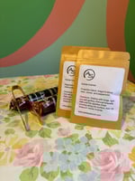 One packet of herbal incense contains my protection blend. It’s made up of dragon’s blood resin, cloves, and peppermint. It’s warming and feels like fall and winter to me. The other is a happiness blend and contains frankincense, chamomile, ginger, and lemon. It’s light and clean and feels like spring.